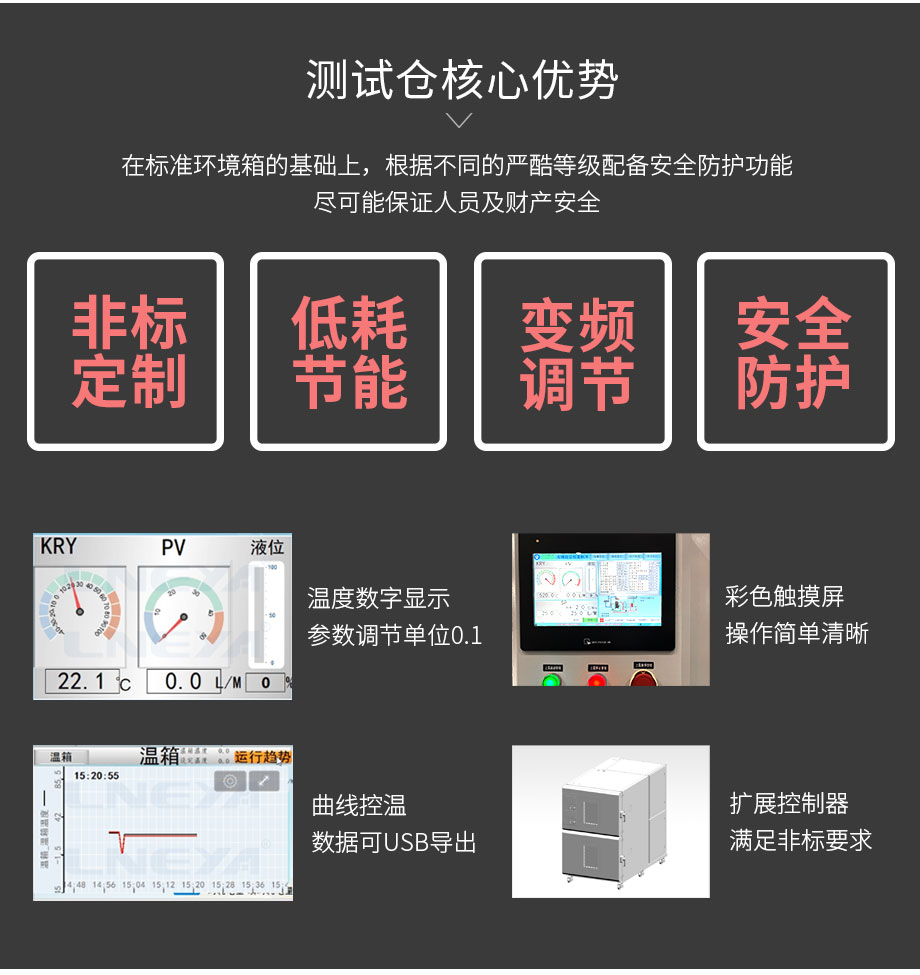 800電池環(huán)境試驗箱是專門針對不同型號電池測試需要,在標準環(huán)境箱的基礎(chǔ)上,根據(jù)不同的嚴酷等級配備安全防護功能,最大程度保證人員及財產(chǎn)安全;變頻自定算法控制,機組運行綜合節(jié)能35%以上。 ,