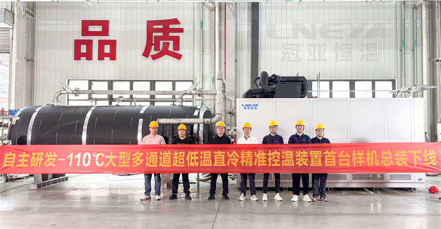 近日,冠亞恒溫車間舉行了自主研發(fā)-110℃多通道超低溫直冷機(jī)組首臺(tái)樣機(jī)總裝下線儀式。