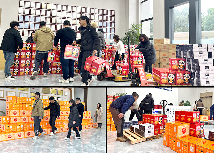 現(xiàn)場熱火朝天~大家齊心協(xié)力,卸下一箱箱年貨。沉甸甸的年貨,承載著新春團(tuán)圓的期望,飽含公司對員工的濃濃關(guān)愛與真摯祝福。