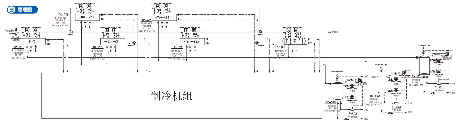 將揮發(fā)VOCs?體導(dǎo)?到設(shè)備冷箱(設(shè)置冷凝溫度 3℃? -40℃? -75℃? -115℃)可以定制其他溫度區(qū),根據(jù)需求進(jìn)?逐級(jí)冷凝液化。部分連續(xù)?產(chǎn)?藝在低溫段做雙路切換?藝(?側(cè)冰堵后,直接切換到另?路換熱冷箱冷凝,同時(shí)冰堵側(cè)做融霜處理)。
