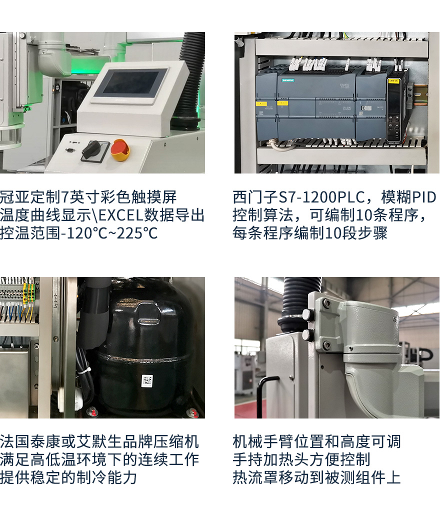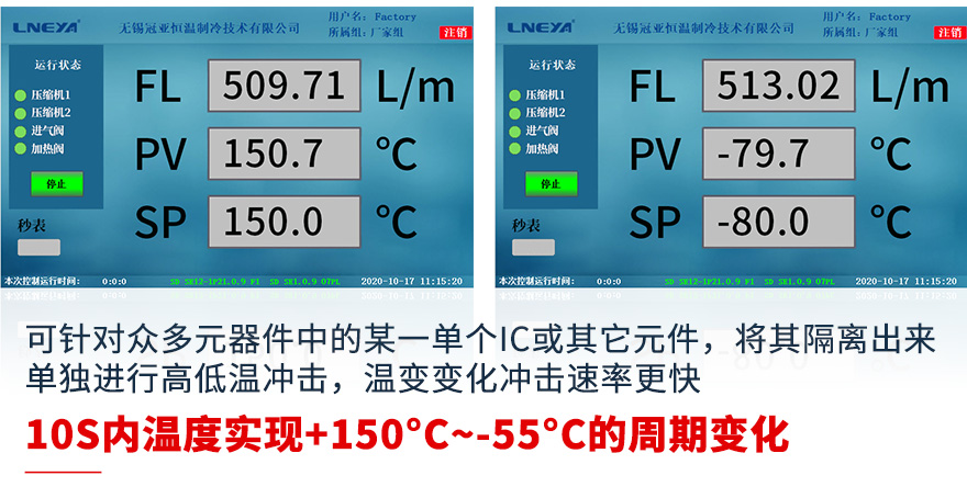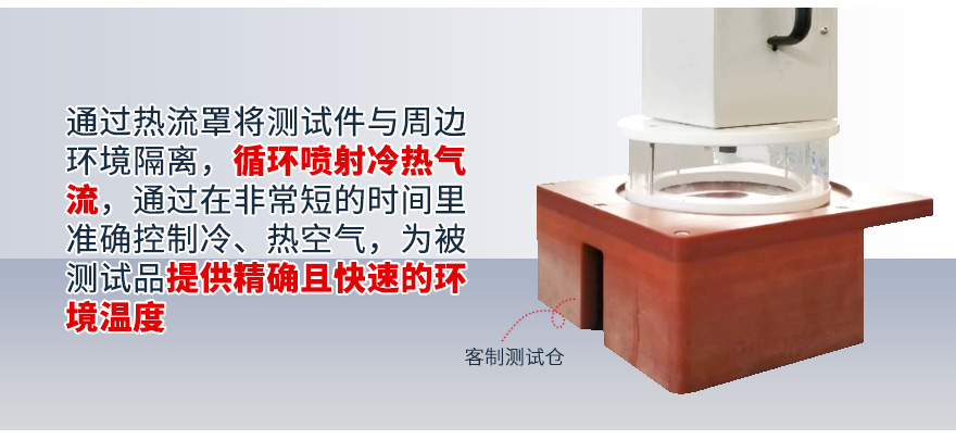1、試驗機輸出氣流罩將被測試品罩住,形成一個較密閉空間的測試腔,試驗機輸出的高溫或低溫氣流,使被測試品表面溫度發(fā)生劇烈變化,從而完成相應的高低溫沖擊試驗;